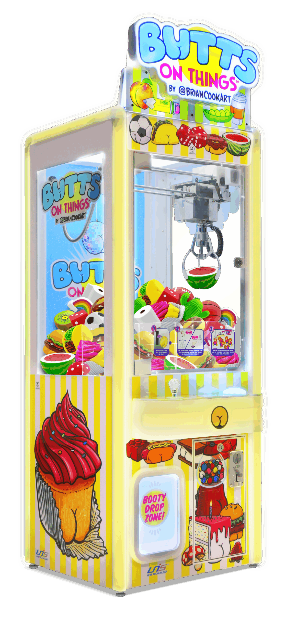 Butts On Things started off as a silly doodle by Brian Cook in 2016, and quickly grew into an international internet sensation. Designs include puzzles, cards & stickers, but now locations can offer an officially branded crane machine with butts on fruity merchandise – both plushies and rubber toys. This 24″ crane machine is compact and affordable, allowing it to go into just about any location, and the claw can handle 3/4″ plushies or 2″ rubber “fruity booties.”